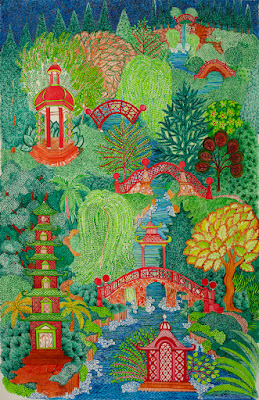 I didn't love it then but when I took it out to be photographed I felt that it had grown on me. I like the variety I gave to the trees, and I like the pallet. And the river with five bridges.